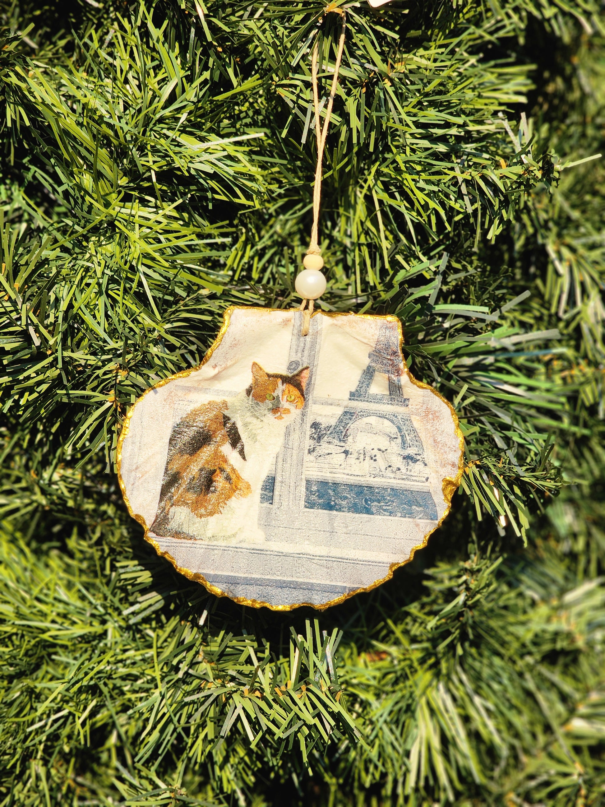 Cat image decoupaged on a great scallop shell. Shells are approximately 3.5" - 5" inches.