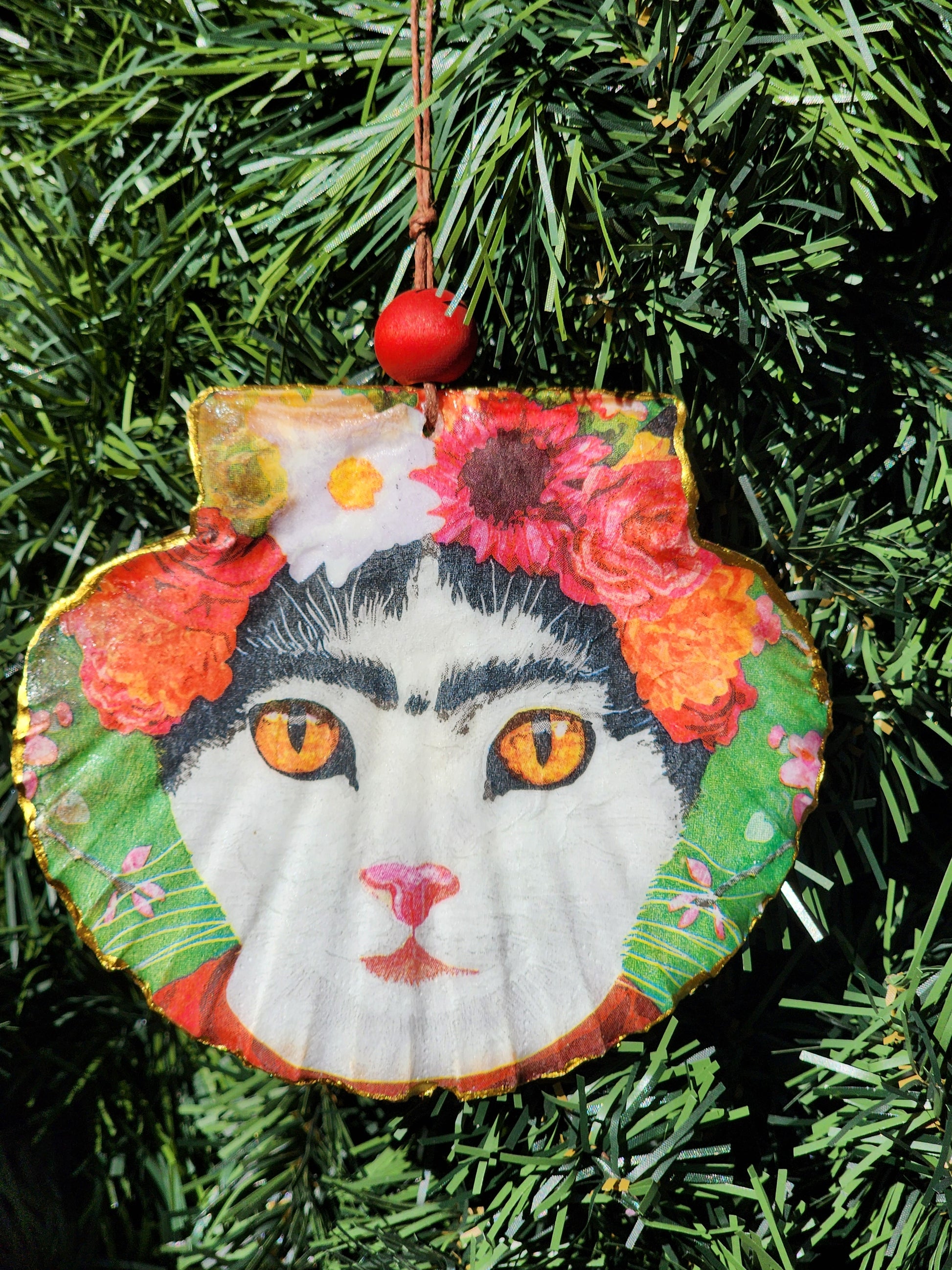 Cat image decoupaged on a great scallop shell. Shells are approximately 3.5" - 5" inches.