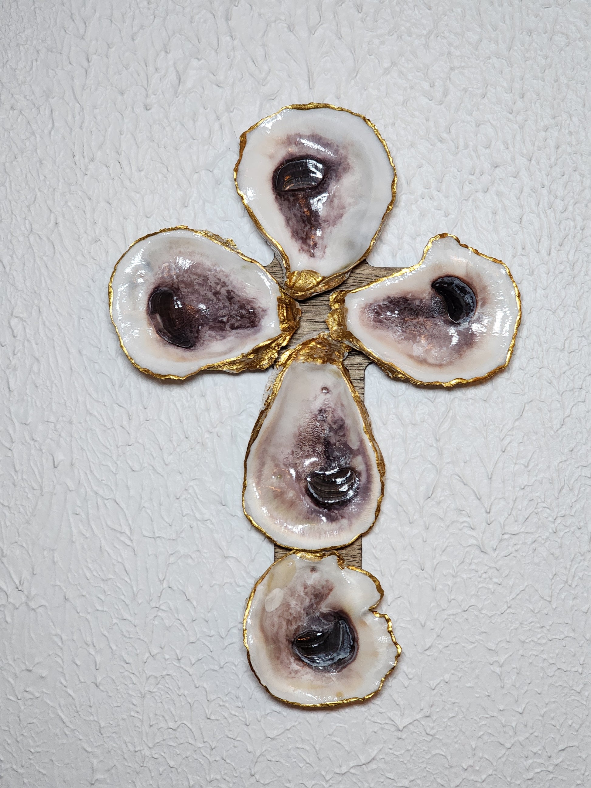 Natural oyster shells have a sealant applied to the interior of each shell. Gold trim painted around the outer edge of each shell. Shells are attached to a wooden cross.