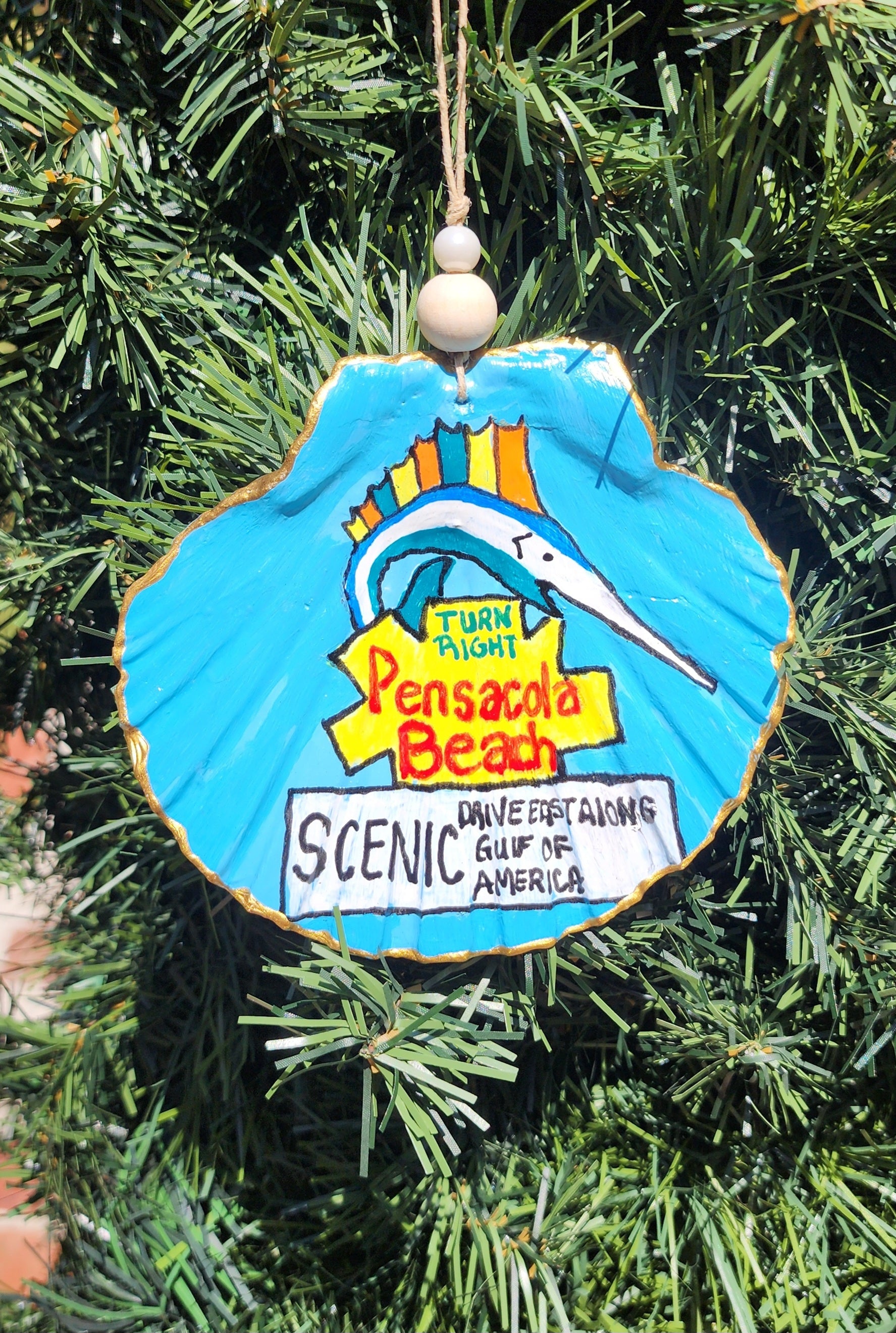 Celebrate your love for Pensacola Beach with our hand painted ornament featuring the iconic beach sign. Painted on a flat scallop shell, this unique piece adds a touch of coastal charm to any Christmas tree or year-round display. A must-have for any beach lover or souvenir collector.