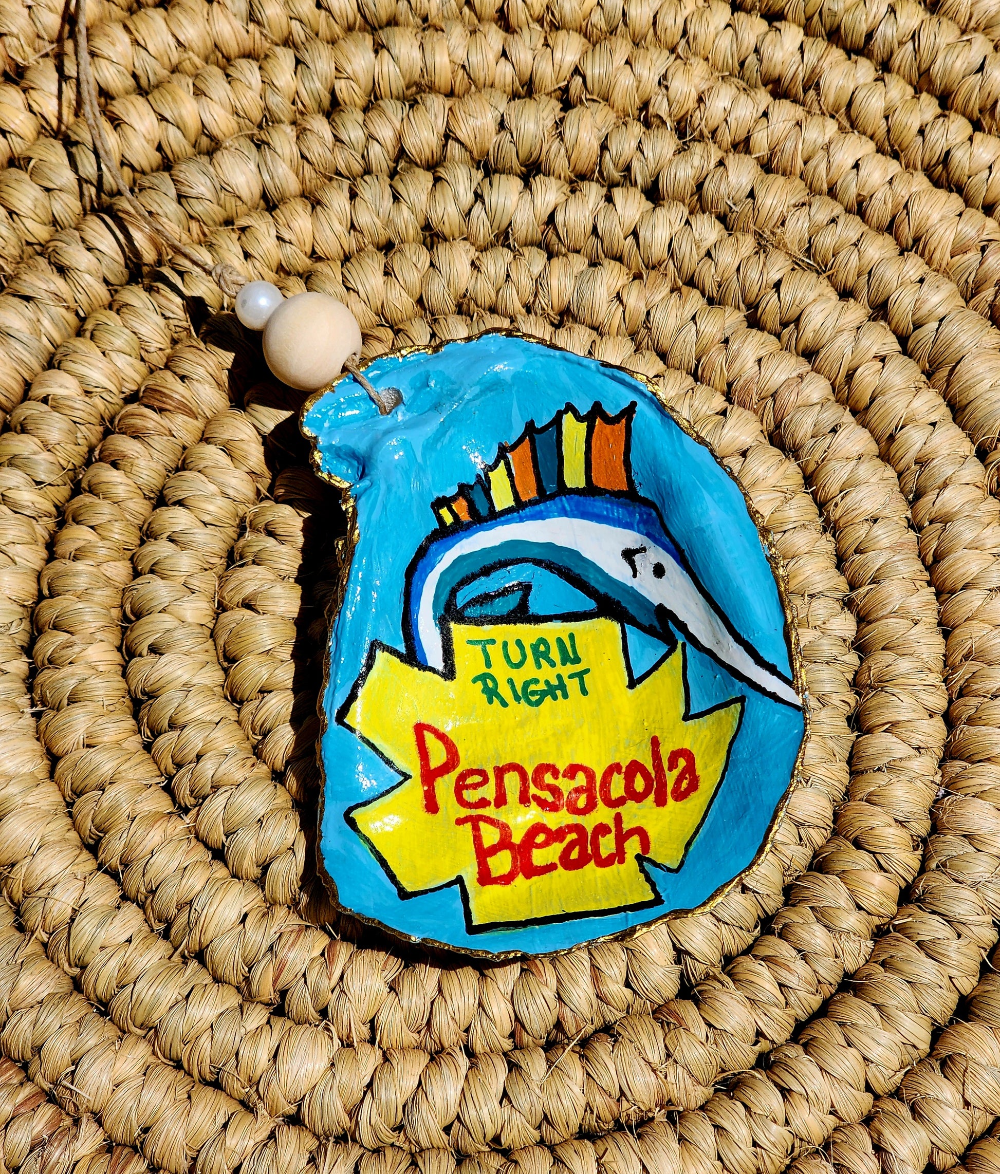 This Pensacola Beach Sign Ornament is hand-painted on a natural oyster shell, capturing the iconic coastal landmark.