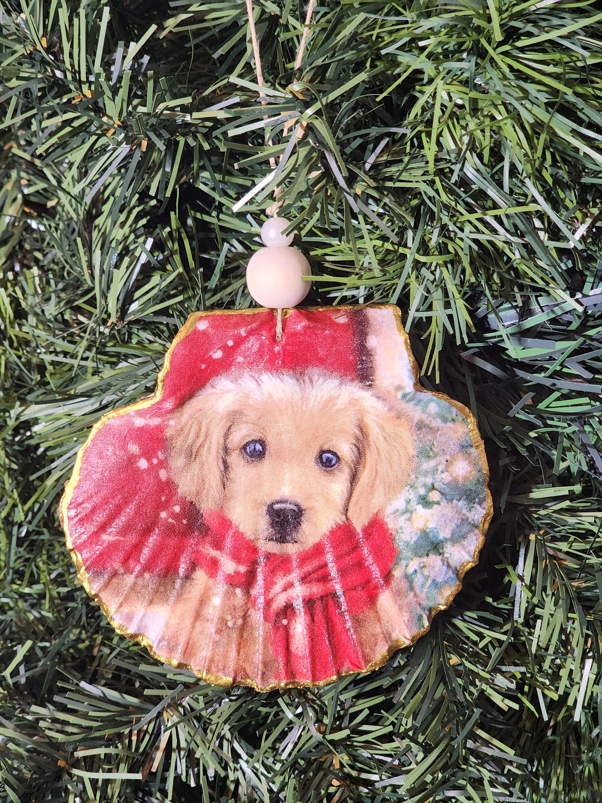 Dog image decoupaged on a great scallop shell. Shells are approximately 3.5" - 5" inches.